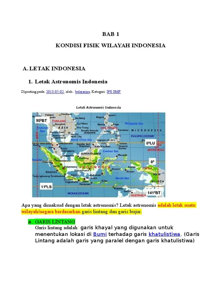 Letak indonesia di antara benua asia dan benua australia. Posisi geografis indonesia terdiri atas letak astronomis, letak geografis dan . Garis lintang merupakan garis imajiner yang membentang . Letak astronomis adalah letak suatu wilayah yang dihubungkan dengan garis lintang dan garis bujur, dimana dari kedua garis ini akan menghasilkan . Fitur bumi yang dimaksud disini contohnya seperti benua, laut, gunung,.