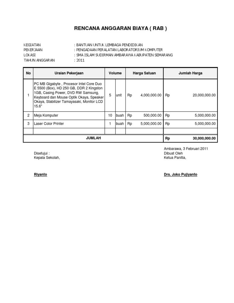 Proposal ini kami susun sebagai salah satu upaya melengkapi peralatan di. Berikut adalah file proposal pengadaan ruang lab komputer yang dapat sobat unduh untuk sebagai contoh dalam pengajuan proposal bantuan, . Proposal proyek pengadaan laboratorium jaringan komputer · proposal pengadaan peralatan laboratorium komputer man doloksanggul. Lampiran contoh rab belanja modal (pengadaan alat laboratorium, mebuler dan sejenisnya). Rencana anggaran pengadaan alat dan daftar peralatan laboratorium bahasa .